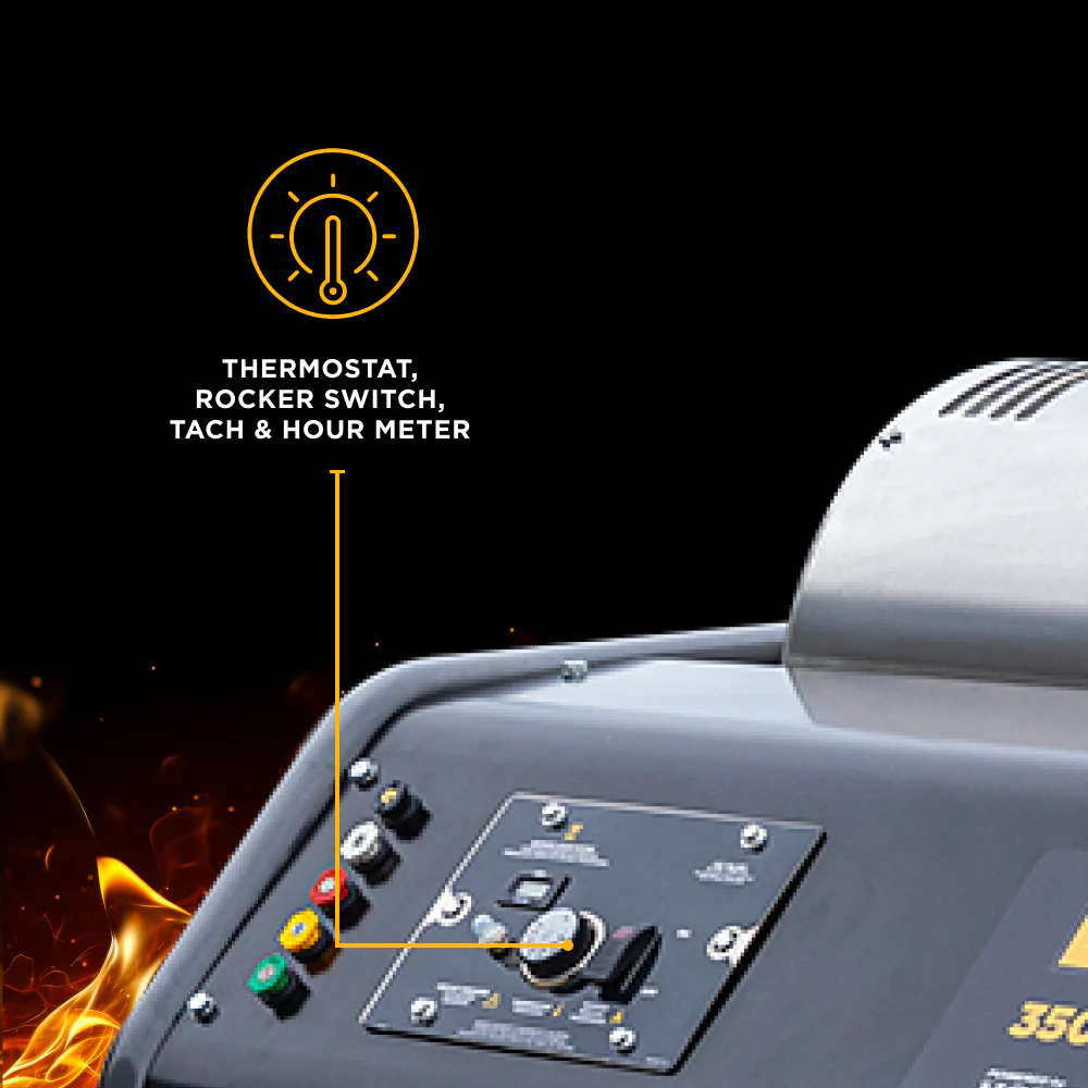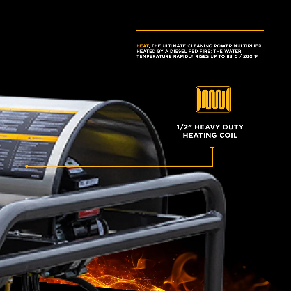 The 12V diesel-fired Beckett burner fires up a high-efficiency heating coil to produce hot water up to 200°F (93°C). The result? Cut through grease, oil, and stuck-on gunk in half the time. And with the adjustable thermostat and rocker switch burner control, you can quickly adapt to hot or cold water jobs.